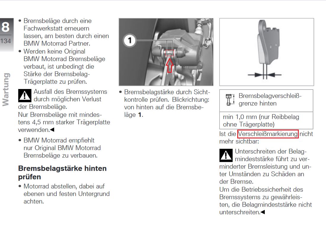 Extra für Dich, oder RTFMBremsbelagstärke vorn prüfen Nur Bremsbeläge mit mindestens 4,5 mm starker Trägerplatte verwenden. BMW Motorrad empfiehlt