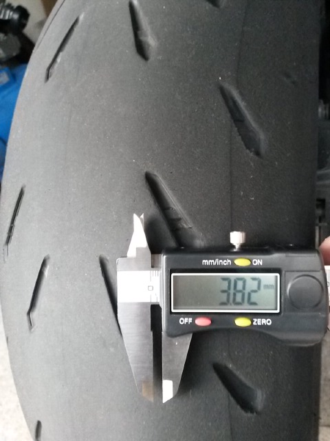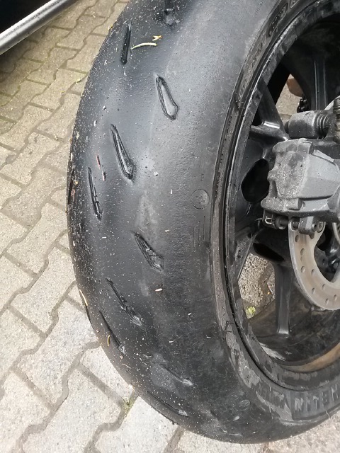Kurz und gut, bis wir wieder zuhause waren, die letzten 600 Kilometer ab ungefähr kurz nach Garmisch, waren wieder über die Autobahn und ich habe mich dann dazu entschieden, den Reifen zu demontieren. Nochmal der Anfangskilometerstand war 31 280 km, beim Endstand von 38360 war das also eine LAufleistung von 7080 km. Hört sich für einen Sportreifen sehr viel an, man darf aber nicht vergessen, dass über 5000 km davon auf der Autobahn absolviert wurde. Bis auf die Heimfahrt waren das zwar meistens Geschwindigkeiten zwischen 160 und 180 km/h, aber eben im Vergleich zur Landstraße recht wenig Kurven anbremsen und aus der Kurve rausbeschleunigen ...