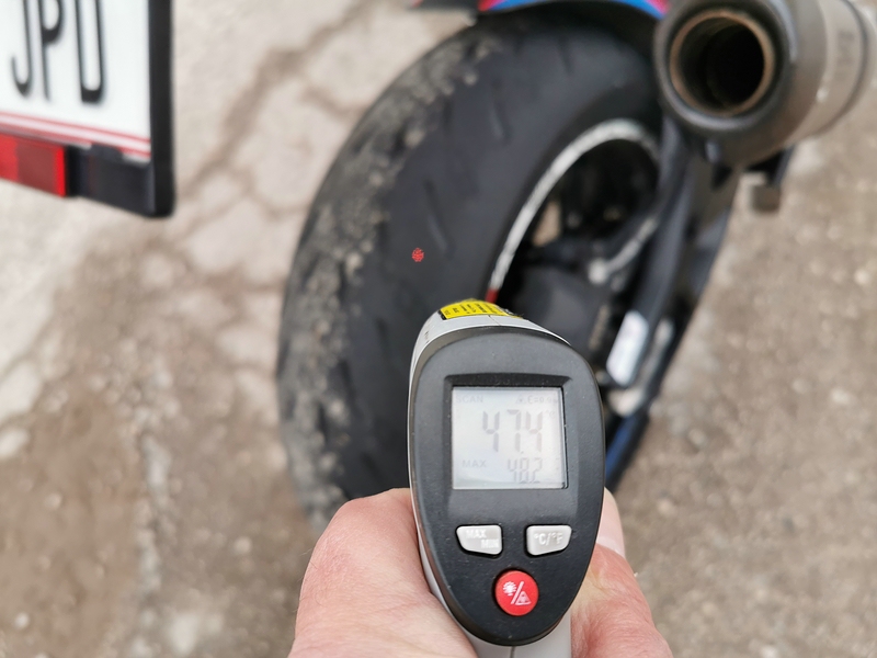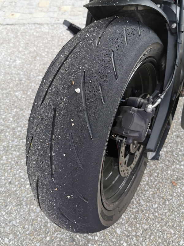 Eigendämpfung etwas besser. Spurtreu, leicht einzulenken. Schnell auf Temperatur. (Asphalt 9° Power 5 45°+ nach ca. 6 km Kurvenfahrt im 3. und 4. Gang)