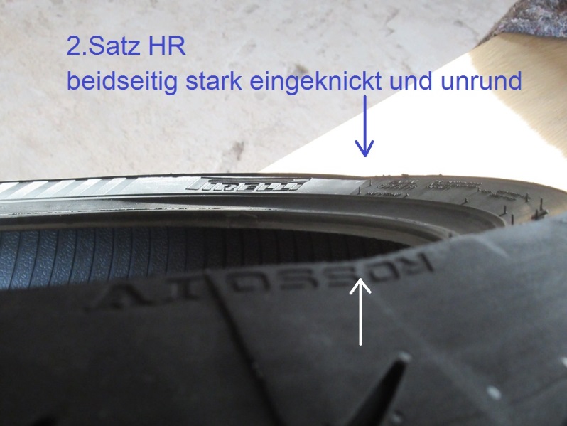 Aber warum weis so etwas dann die Reklamations-Abteilung bei "reifen.de" nicht? Zitat: Reifen nicht montieren. Er muss zurück. Kaufpreis wird erstattet und die ganze Charge wird geprüft. Er meldet sich dann. Bei einem Autoreifen kein Problem, aber er glaubt nicht, dass der Reifendruck diese steife Kante (ist auch Draht drin) komplett rausdrückt.