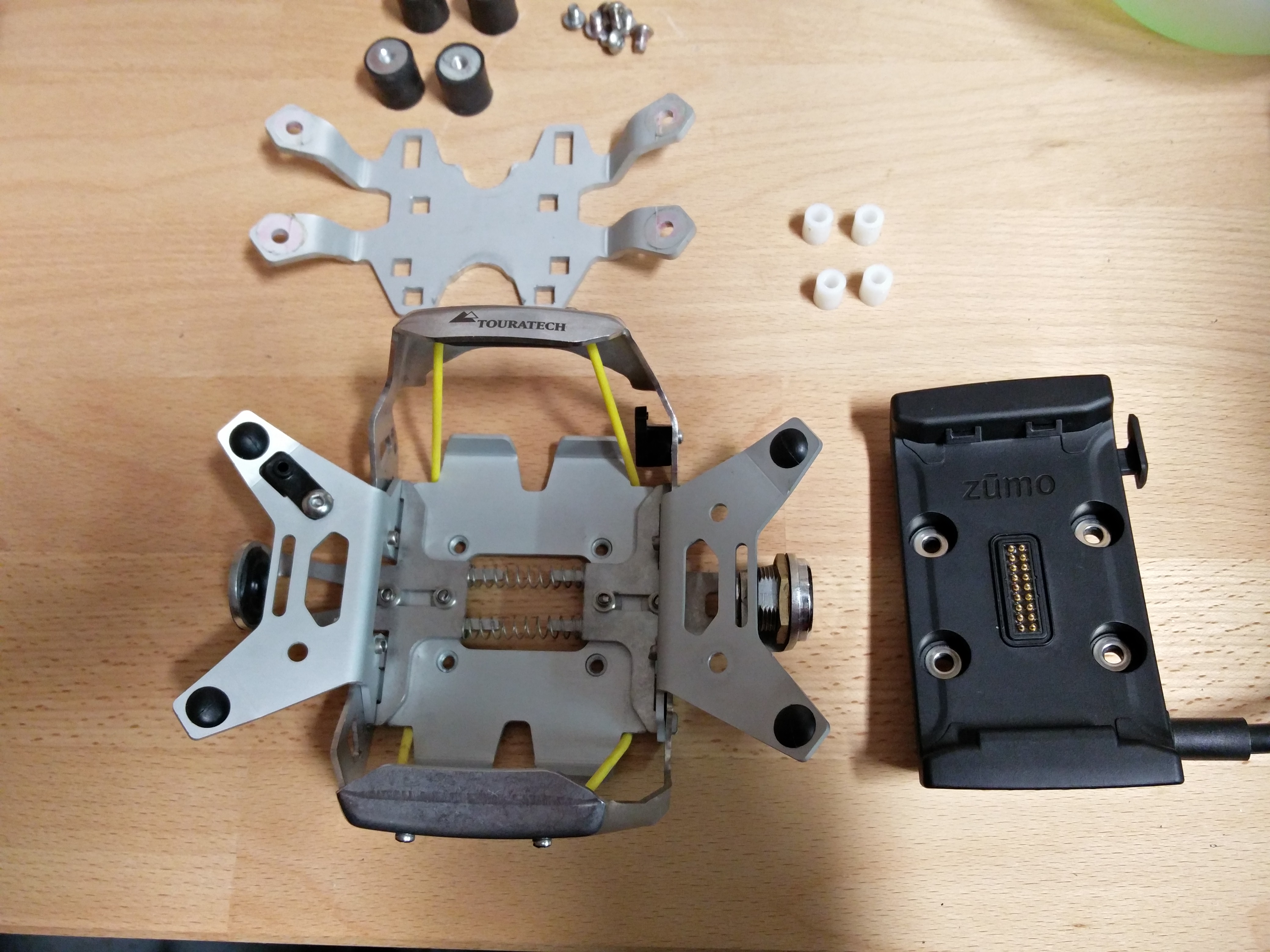 - verwendet habe ich die 4 original Cradle-Schrauben. Diese können durch das "Sandwich" Garmin Cradle/Distanzhalter/TouratechHalter gesteckt und mit der BMW Grundplatte verschraubt werden