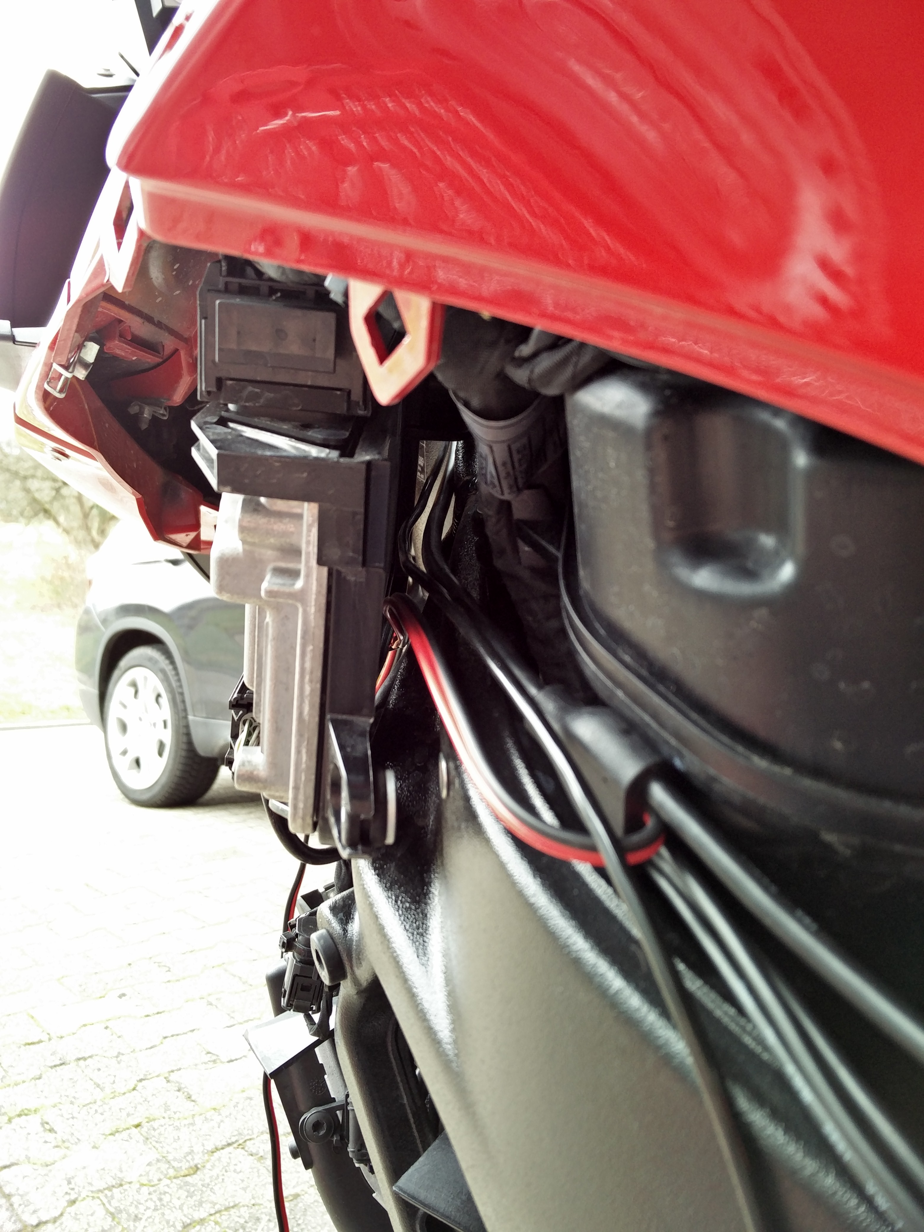 2) wenn der Touratech Halter montiert ist, Kabel wie das Original nach unten durchfädeln (auf Bewegungspiel des Windschildes achten)
