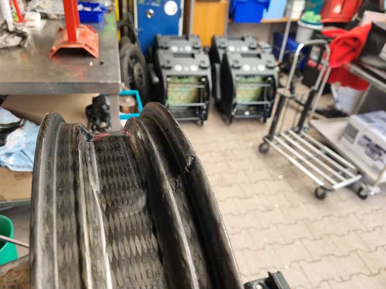passierte beim aufziehen der 2ten seite, das knirsch kam, sofort den fuss vom pedal, zu spät. es war genug schwarze schmatze dran, wir hatten gut +25°c, das gummi war warm...warum nur? und wie gesagt, bestimmt 8x gut gegangen...mit unserer maschine...