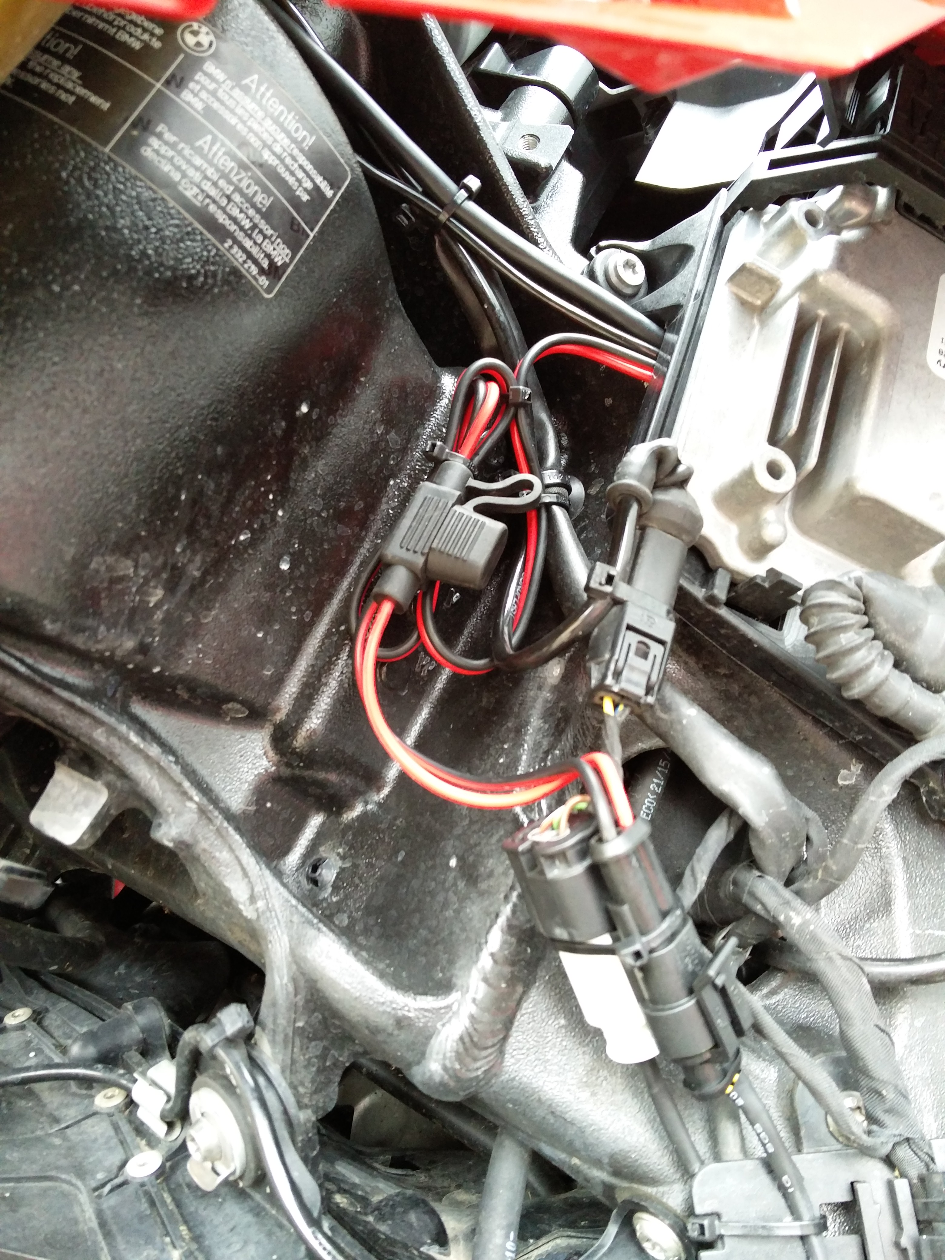3) kompletten Kabelstrang hinter dem Motorsteuergerät entlang legen (es muss gelöst werden. Hier habe ich mit zwei Klebepads und Kabelbinder die Kabel fixiert. Ganz wichtig: Kante des Motorsteuergerätehalters abrunden, sie ist sehr scharfkantig)