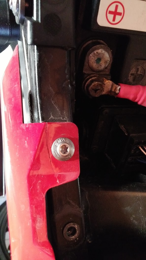 Die rote Heckverkleidung ist dort ja mit der Schraube befestigt. Hier sieht man knapp links von der Schraube einen fast senkrechten Strich/Riss entlang gehend.