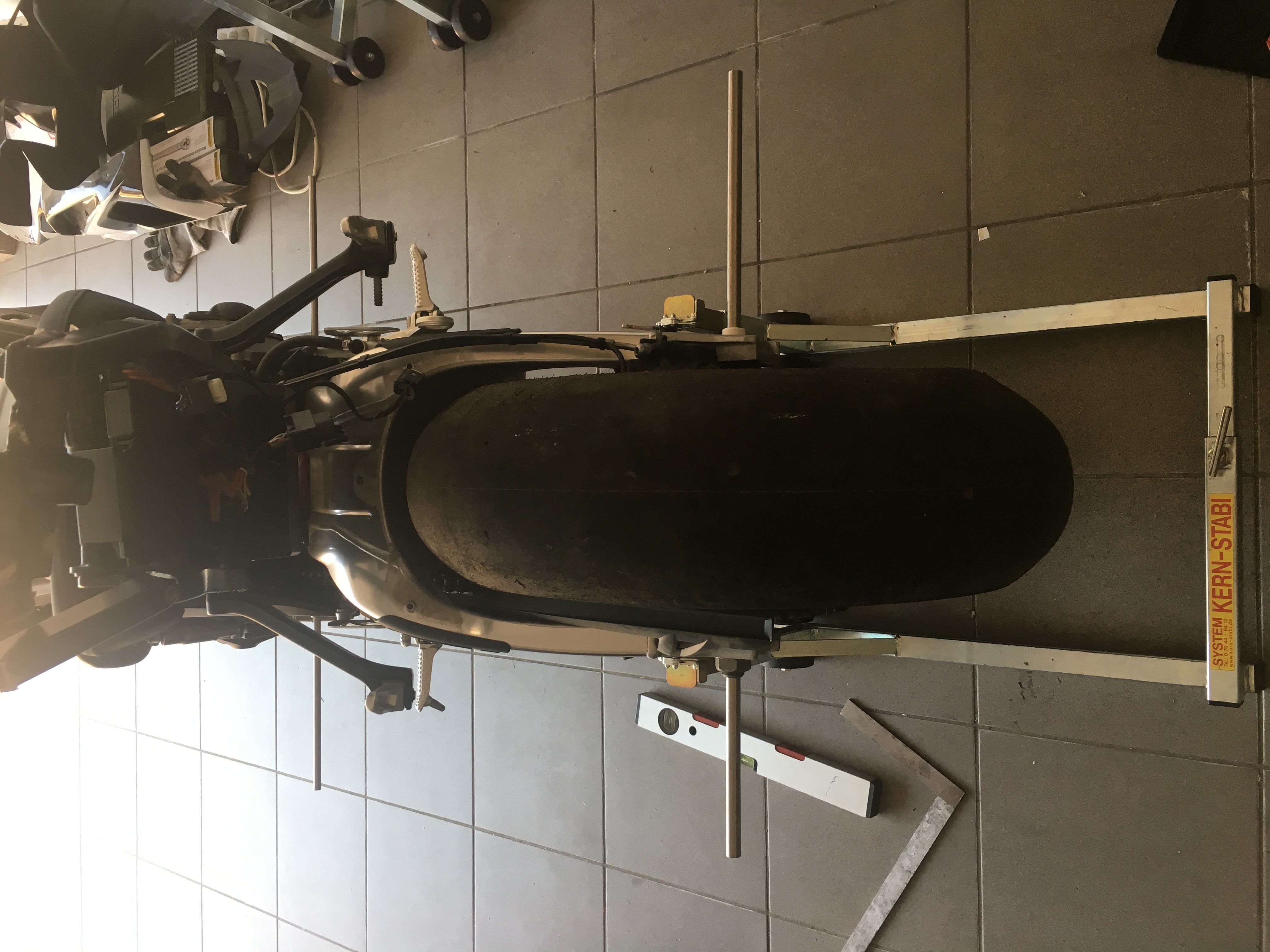 Ich habe einen SV mit einer Scheibner Fahrwerkslehre hier gehabt. Der Hauptrahmen wurde vermessen und alles im grünen Bereich. Die Schwinge wollte er immer mit der Felge messen. Die Felge ist aber derart zertört, das damit kein valides Messergebnis zustande kommen kann.
