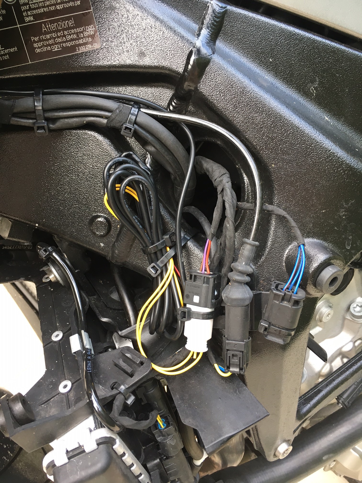 Kabelverlegung an S1R entlang dem vorhanden Kabelstrang, bei Nichtbenutzung stecke ich das Kabel um 180 Grad unter die Lampenmaske und mache es mit dem vorhanden Gummibinder fest. Evtl. kommt noch ne Abdeckung drauf. Genauso bei der 800GS.
