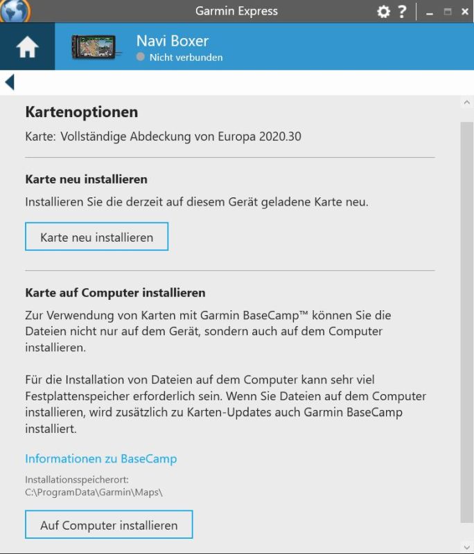 Sehr geehrte Damen und Herren, ich besitze ein Navigator V und habe einen neuen Computer. Als erster installiere ich die neuste Version von Express und verbund das Navi mit dem PC. Anschließend habe ich das neuste Update für das Geräte geladen (v. 3.5.0). Um Routen vernünftig zu planen wollte ich wie früher auch Basecamp nutzen. Dazu wollte ich die Karten auf meinen PC installieren. Jedoch gibt es keinen Button mehr dafür. Den Knopf "Kartendetails" gibt es nicht mehr. Siehe hier: https://www.screencast.com/t/77bjf3mE Zudem tauchen nach erneutem Start von Basecamp zwei Navis bei mir auf, ich habe aber nur eines. Anschließend installierte ich Basecamp in neuster Version. Nach Verbinden mit dem Navi wurde auch etwas vom Navi runtergeladen und ich konnte unter Karten die Karten, Global wählen, NTU 2020.03 und NTU 2020.03 SD Card. Unter global funktioniert alles flüssig. Wähle ich NTU oder NTU SD Card, kommt eine Meldung das auf dem PC Karten installiert währen und das schneller gehen würde. Ich klickte ja aber es geht überhaupt nicht schneller. Die Karten werden teilweise sogar nicht vollständig geladen. Mein Eindruck ist er greift denoch über USB auf das Gerät zu und lädt überhaupt nichts vom PC (ist ja auch nichts installiert). Sobald ich das Navi abstecke habe ich auch nur noch die Globalen Karten. Karten installieren geht auch nicht, da mir die Software sagt es gäbe nichts zu installieren. Unter Kartenverwaltung sehe ich wie er bei angestecktem Gerät unter Appdata/roming/temp irgendwas von USB zwischen gespeichert hat. Wie kann ich nun Karten von meinem Navi auf den PC laden damit das auch ohne Navi flüssig funktioniert. Bei meinem alten PC ging das ohne Probleme. Sieh hier: https://www.screencast.com/t/5J65jkD0XK1i Ich verwende Windows 10 Pro 64 bit mit neustem Update Build 19041 Vielen Dank mit freundlichen GrüßenGuten Tag,