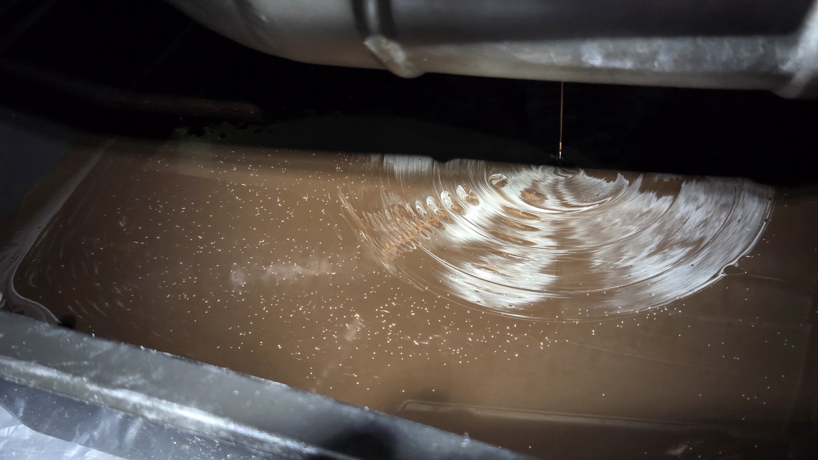 Jedenfalls habe ich das Öl abgelassen, und man sieht auf dem Bild einen deutlichen silbernen Schleier. Jetzt habe ich nur das Öl abgelassen, ohne den Motor warm laufen zu lassen. Das stand also so jetzt seit knapp fünf Monaten. Frage an euch. Kann das damit Zusammenhängen, dass der Motor nicht lief und wir hier etwas Wasserbildung sehen... oder Habe ich wirklich ein Thema - sprich das Öl sollte so überhaupt nicht aussehen und der Motor schmeißt einfach zu viele Alu-Späne?