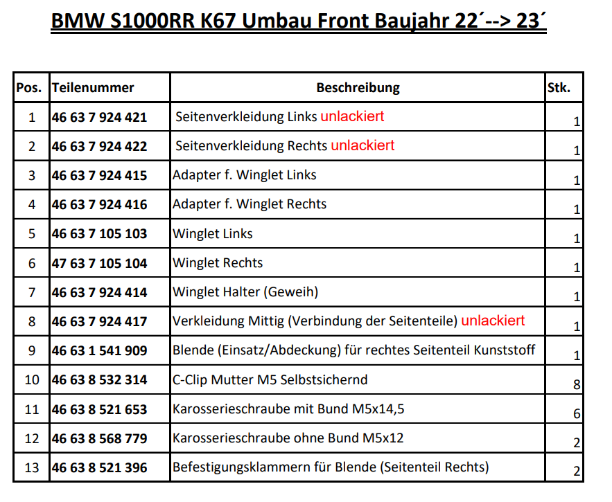 Ich hatte mich dazu entschieden die komplette Verkleidung Vorne der 23er bei BMW zu bestellen, also Seitenverkleidung rechts/links, Mittelteil, Winglet rechts/links + alle Teile die halt für die Montage benötigt werden wie das "Geweih" ( wo die Winglets wirklich dran befestigt werden und auch die Adapterplatten welche hinter die Verkleidung kommen) mit Schrauben usw.