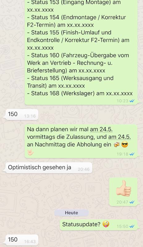 Erst hieß es: April. Dann Juni. Dann gab es keinen Termin mehr. Dann kam das Angebot mit dem 2018er Leihmoped, das wir ablehnten. Dann diese Woche plötzlich per WhatsApp von meinem Verkäufer: