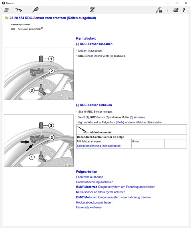 Habe hier auch noch das Anziehdrehmoment gefunden. Drehmoment für Hinterrad laut BMW-Dokumentation analog (6 Nm). Alle Angaben jedoch ohne Gewähr.