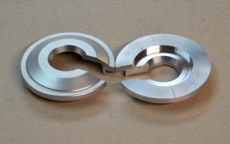 Links der originale Federteller und rechts der neue aus AW 7075. Man sieht deutlich die unterschiedliche Höhe der Auflagefläche am Federbein.