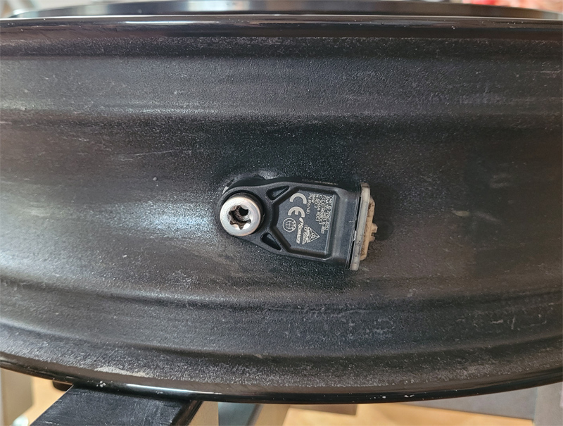 Der Reifen ist runter. Anhand der Ausrichtung des RDS Sensors kann man auch die Schiefstellung des Winkelventils abschätzen.