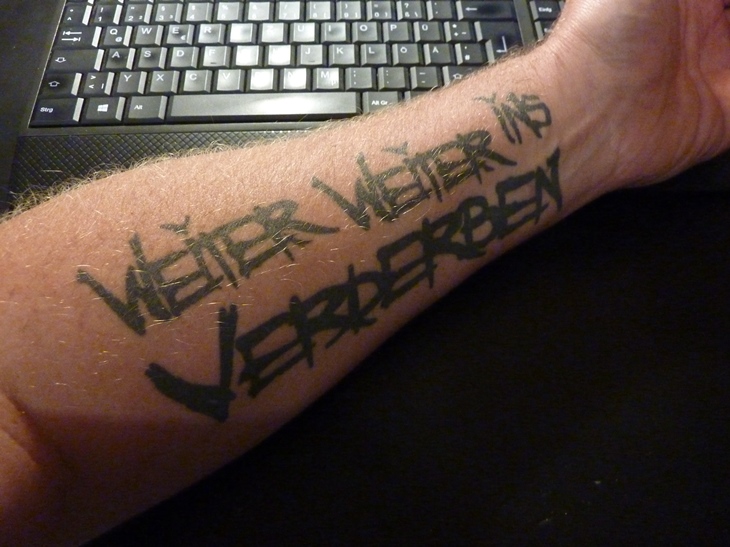 Heli hat geschrieben:... der hatte auch wirklich so einen Tapetenspruch am Unterarm tätowiert...