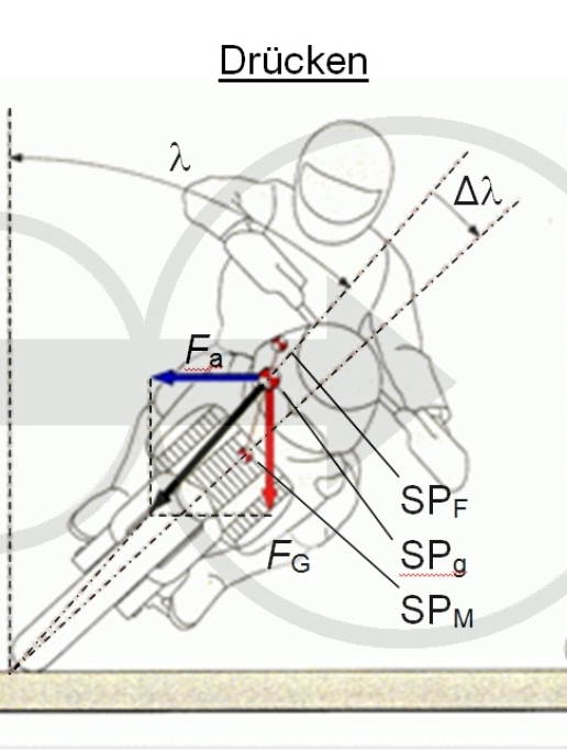 Beim Fahrstil "Drücken" liegen in der Schräglage nicht alle Schwerpunkte (Fahrer, Maschine, gesamt) auf 1 Linie.