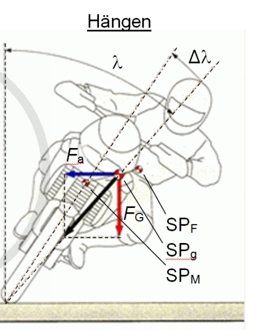 Beim Fahrstil "Hängen" liegen in der Schräglage ebenfalls nicht alle Schwerpunkte (Fahrer, Maschine, gesamt) auf 1 Linie.
