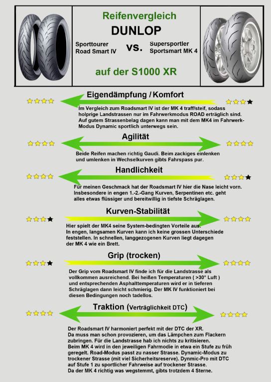 Generell will ich mit meinem Testbericht eine Gegenüberstellung vom Dunlop Roadsmart IV mit dem Sportsmart MK4 machen. Vielleicht kann ich damit ja dem einen oder anderen eine Entscheidungshilfe bei der XR geben "Sporttourer- vs. Supersport-Reifen".