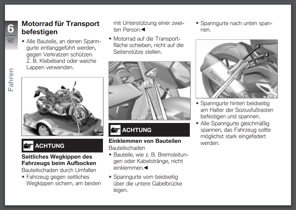 BMW Motorrad gibt sogar an "Alle Spanngurte gleichmäßig spannen, das Fahrzeug sollte möglichst stark eingefedert werden."