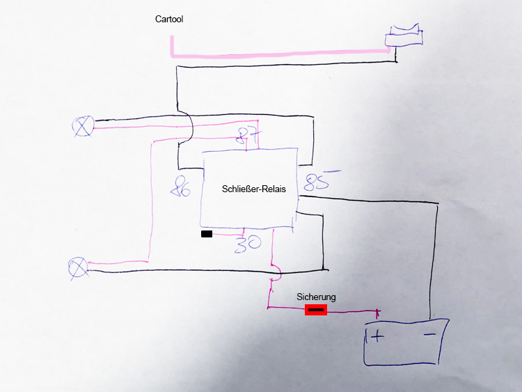 rookie15 hat geschrieben:Gerne, hab es dir noch schnell in das Bild gezaubert. Oben links das Zündungsplus vom Cartool-Stecker. Der Schalter wird keine Verbindung zu (-) haben, daher habe ich das gelöscht. Braucht man nur, wenn der Schalter beleuchtet ist. Sieht auf dem Kabelbaumbild aber nicht so aus. So bekommst du es bestimmt hin :D