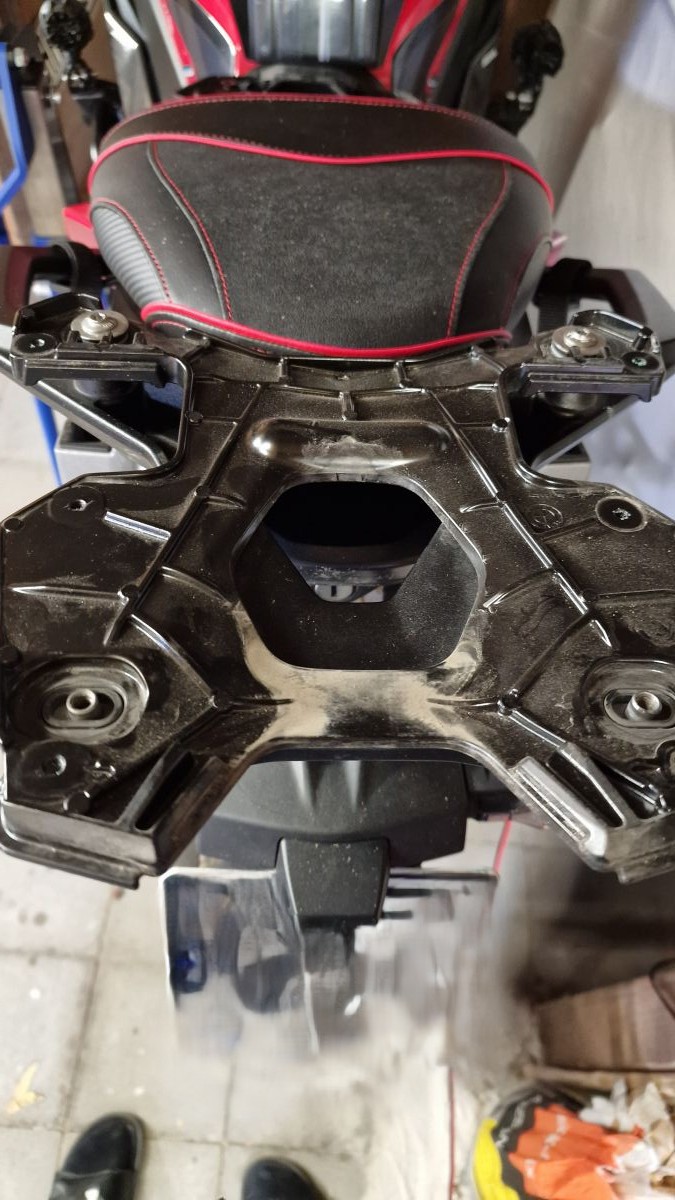 Nach Entfernung Topcase-Halterung, Befestigungsrahmen, Kofferhalterungen und Innenrahmen sowie den hinteren unten liegenden Verkleidungsteilen (rechts in Fahrtrichtung dran gelassen, aber gelöst, sonst ist die mittlere Abdeckung nicht abzubekommen). Die zentrale Plastikabdeckung für die Steckergegend ist auch schon weg.