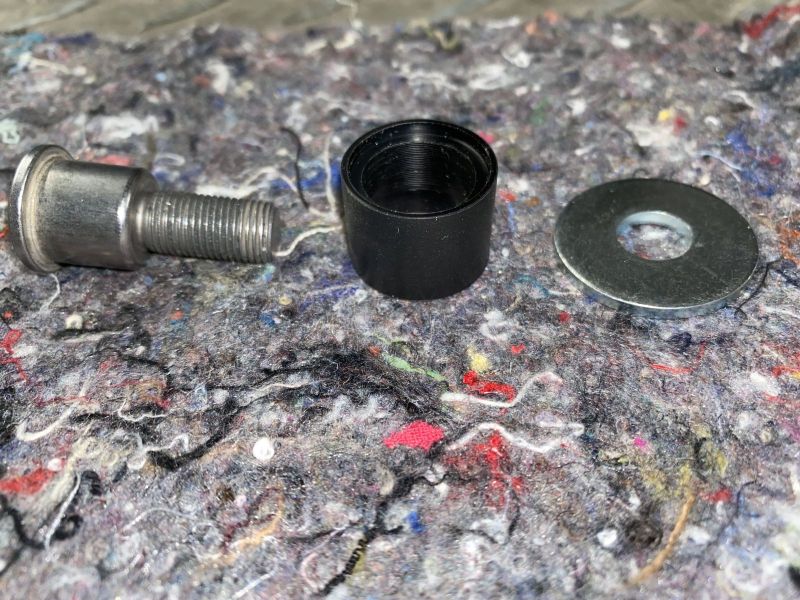 Dazu brauchst Motorradseitig die beiden originalen Bolzen des Hauptständers (links im ersten Bild) dazu optimalerweise zwei selbst gedrehte Hülsen aus verschleißfestem POM Kunststoff und zwei Beilagscheiben zum Schutz des Rahmens. Ohne die Hülsen geht man halt direkt auf die originalen Bolzen - dann glaube ich brauchst Du 20er Nüsse, aber sicherheitshalber nachmessen. (Zu meinen Hülsen passten 22er Nüsse)