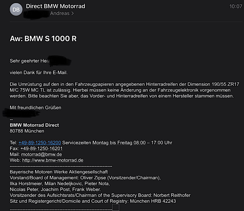 Den Verdacht in der Richtung dass irgendwo der 200er in Zusammenhang mit den Schmiedefelgen steht, kommt daher dass wie ich schon mal in dem Thema Bestellung geschrieben habe, ich vor der Bestellung meines Moped den BMW Kundenservice angeschrieben hatte und angefragt hatte ob die Schmiedefelgen die ab Werk mit 200er ausgeliefert werden eine Freigabe zur Umrüstung auf 190er haben verneint wurde.