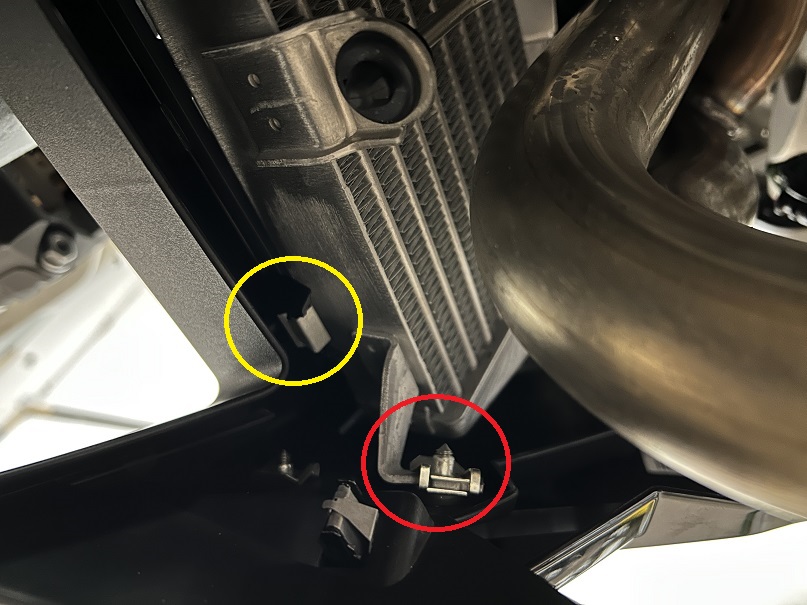 um es euch nochmal detaillierter zu zeigen: In dem Foto sieht man genau das "Problem" in dem gelben Ring. Das ist die Stelle die am Kühler scheuern kann. Man kann aber die Kühlerschützer gar nicht anders positionieren und ausrichten, das geht nicht! Die sitzen genau mit den Klammern an der vorgesehenen Position.