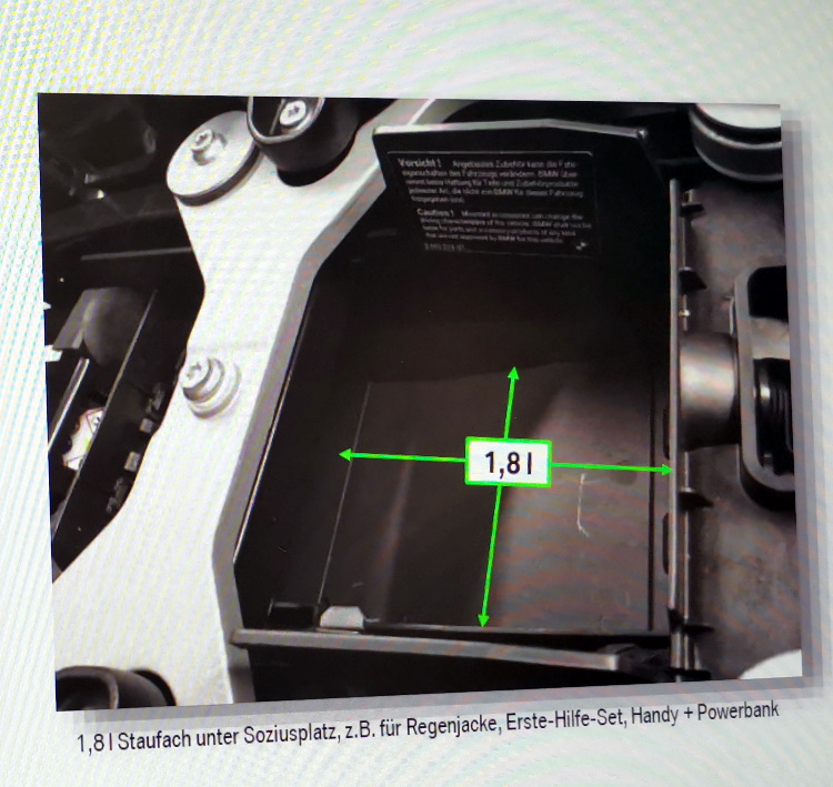 Und unter dem Soziussitz haben Sie jetzt ein Staufach in dem 1,8 Liter Volumen hin gemacht: