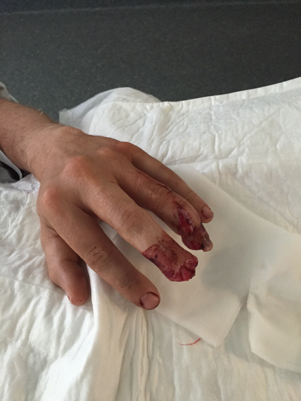 Zusammenstoss mit einem entgegenkommenden PKW. Die Finger sind wohl zwischen Lenker und PKW geraten.