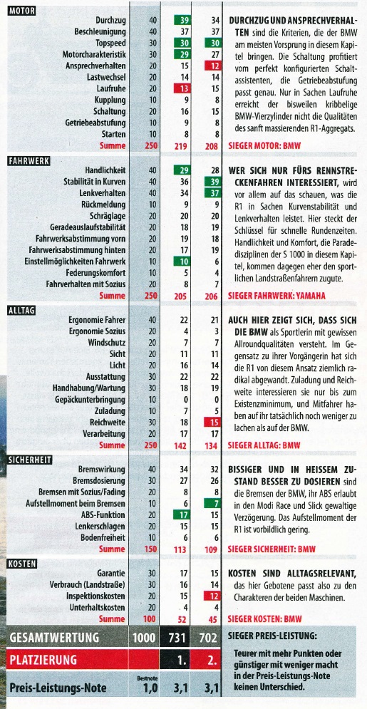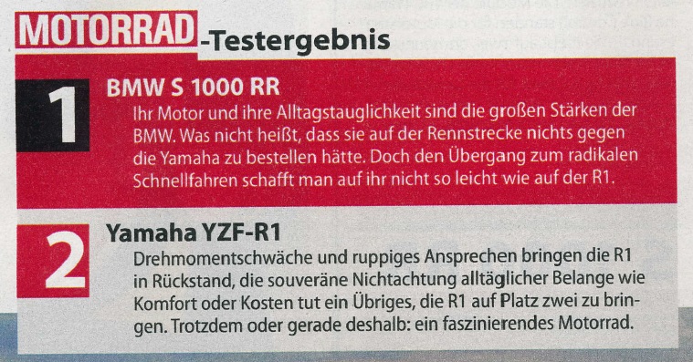 ...also wenn schon "gleiche Waffen" ( ich muß aber auch sagen dieser Ausdruck gefällt mir nicht - besser wäre Vergleichsvorraussetzungen ! ), dann muß man die RR-2015 mit elektronischem Sachs-Fahrwerk auch entsprechend mit der R1-M mit elektr. Öhlins-Fahrwerk vergleichen scratch ...oder hat man sich das nicht getraut winkG ...bei einem OEM-Vergleich dürfte die RR entsprechend auch nicht mit HP-Schmiedefelgen ausgerüstet werden ( wenn es so wäre )...