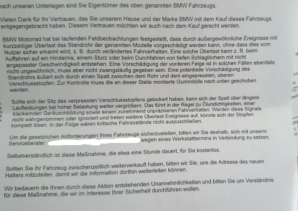 Letztlich ist es aber, ohne bewertende Stellungnahme zu dem Artikel in der MOTORRAD nehmen zu wollen, besser im Zweifel einen Rückruf zu veranlassen.