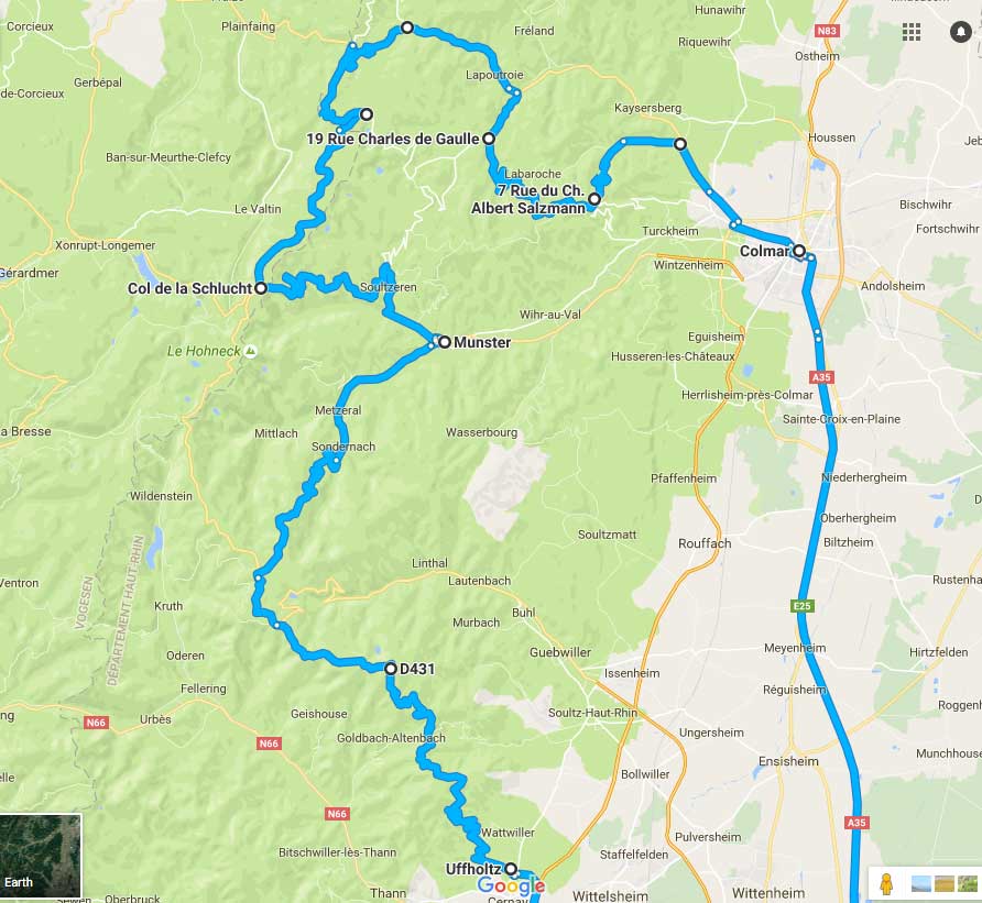 einstieg bei uffholtz, rauf zum grand ballon, an einer hirschkuh sammt kalb vorbei (trotz 4 hufantrieb keine beschleunigung aufm asphalt) via col du platzerwasel nach munster. von dort auf den col de la schlucht und weiter auf den col du calvaire. dort war dann die abfahrt richtung orbey gesperrt (und ich weiss natürlich noch nicht, wie ich das dem navi kurz erklären kann. das problem werd ich dann donnerstag lösen, habe mich kurzfristig an einen navi-kurs angemeldet, so geht das einfach nicht weiter. teures gerät und keine ahnung von der bedienung und zu faul, das handbuch zu lesen.) also mit kleinem umweg via col du bonhome nach orbey, von dort rauf nach trois épis und wieder runter nach ammerschwihr, colmar und via A5, man(n) nähert sich dem topspeed und A98 heimwärts.
