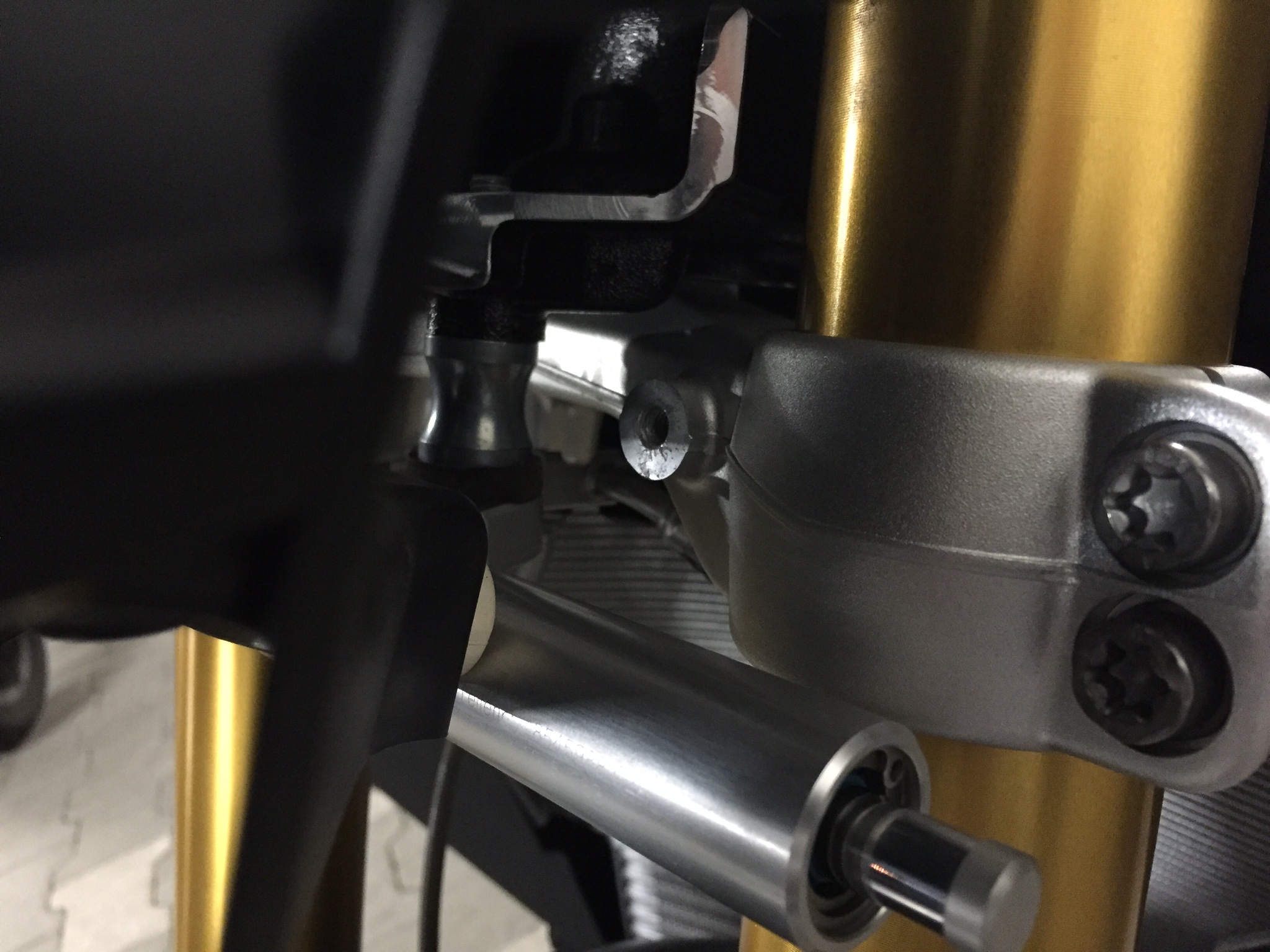 Somit musste ich die unteren beiden Schrauben an der Querstrebe der Gabel lösen, um die Maske nach vorne zu klappen. Dabei ist mir aufgefallen, dass mein Gewinde bereits beschädigt wurde. Was für ein Schrott.