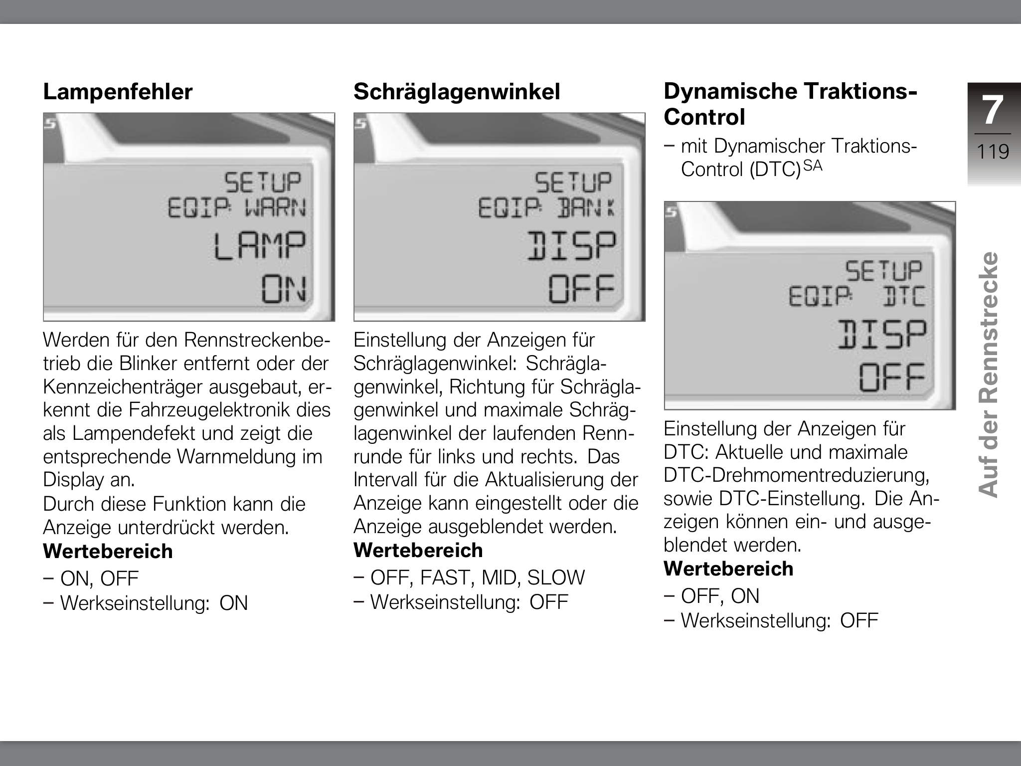Die Einstellung von Schräglagenanzeige, DTC, DDC, ... funktioniert genauso. Wenn man einmal das System begriffen hat ist es eigentlich nicht so schwer. Beim ersten mal die Seite mit der DiebstahlWarnAnlage aufschlagen, den Einstieg in das Setupmenü nach Anleitung machen und der Rest ist dann Selbsterklärend.