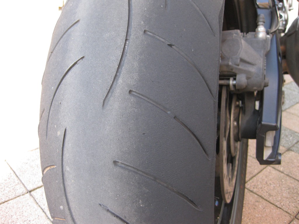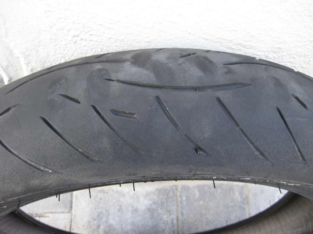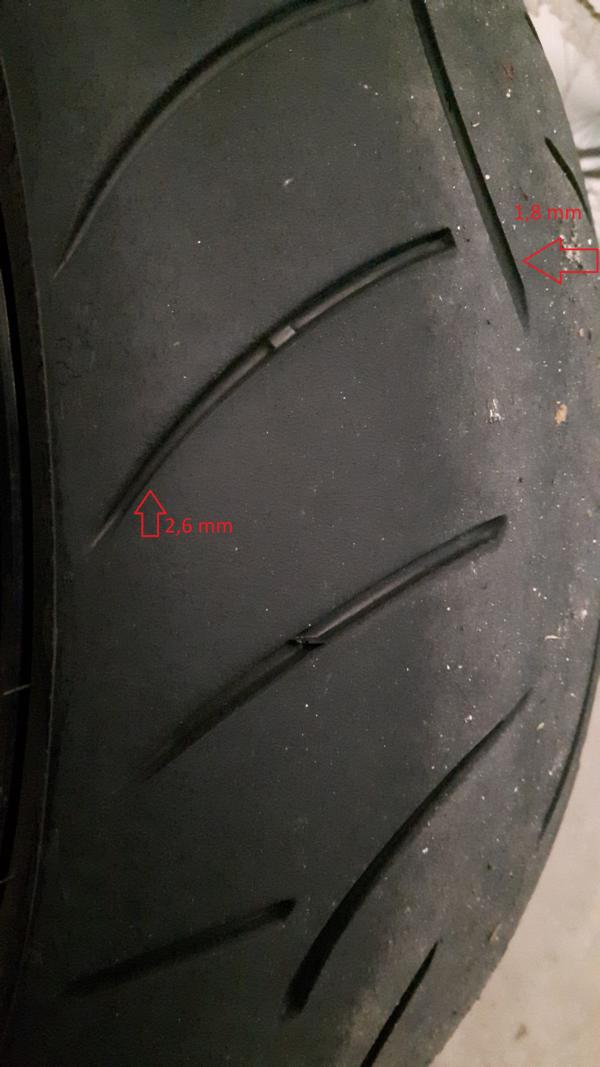 Die Ernüchterung kam dann im Trockenen. Da fiel mir dann die im Vergleich zum Z8 anders ausgeformte Kontur und das Profil des Hinterrads auf. Zumindest etwas weniger Abrollkomfort dürfte ne objektive Aussage sein, wie mir die Kontur gefällt eher subjektiv und bei jedem anders. Nicht dass der RT01 nicht funktioniert, im Gegenteil, egal in welchen Merkmal, ob Handlichkeit, Einlenkverhalten usw., scheint der RT01 etwas messbares zugelegt zu haben. Auch beim Verschleißtest nach LeMans gabs nach 2700 km Hinweise darauf, dass er auch bei der Laufleistung besser sein könnte. Dieser Unterschied kann aber auch noch im Bereich von Messungenauigkeiten liegen, wie will man 0,2 mm (auch mit nen digitalen Präzisionsmessinstrument) verlässlich messen. Wenn der Test doppelt so weit gegangen wäre und auch der Verschleiß dann 0,4 mm gewesen wäre, hätte es im besten Fall irgendwelche Prozentwerte bestätigt, mit denen der Hersteller wirbt, aber das ist mir ehrlich gesagt nicht so wichtig.