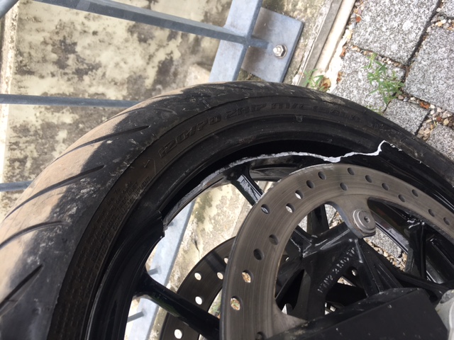 Rahmen ist gebrochen, Lenkkopf kaputt, Gabel bestimmt aucht nicht mehr gut, Auspuff hin, rechte seite allgemein angeschrammt...