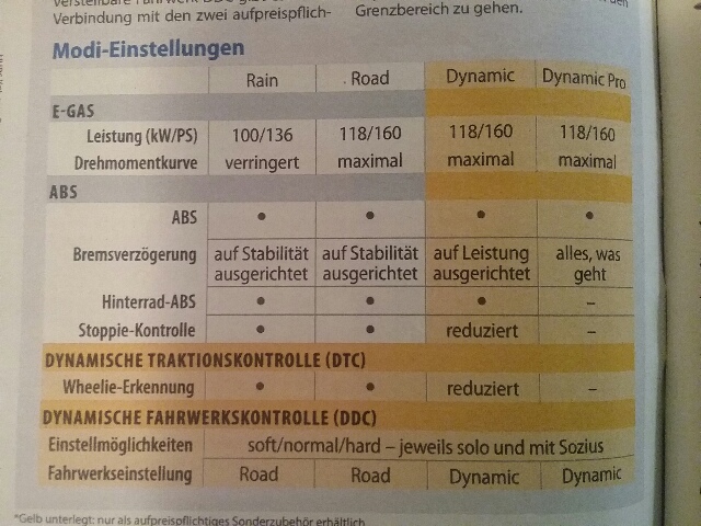 Eifelbiker hat geschrieben:Die Modi ändern, so weit ich das weis und es mir auch deutlich so vorkommt, ( siehe Tabelle) die Intensitäten vom Ansprechverhalten + eben das in Dynamik im Gegensatz zu Road ( nicht irrtümlicher Weise Sport genannt ) die Wheelie Kontrolle mehr Wheel-Höhe ( Neigungswinkel und Tendenz) zulässt und ebenso auch gegen Ende von Knallbremsungen Stoppies bis hin zu einem Überschlag.