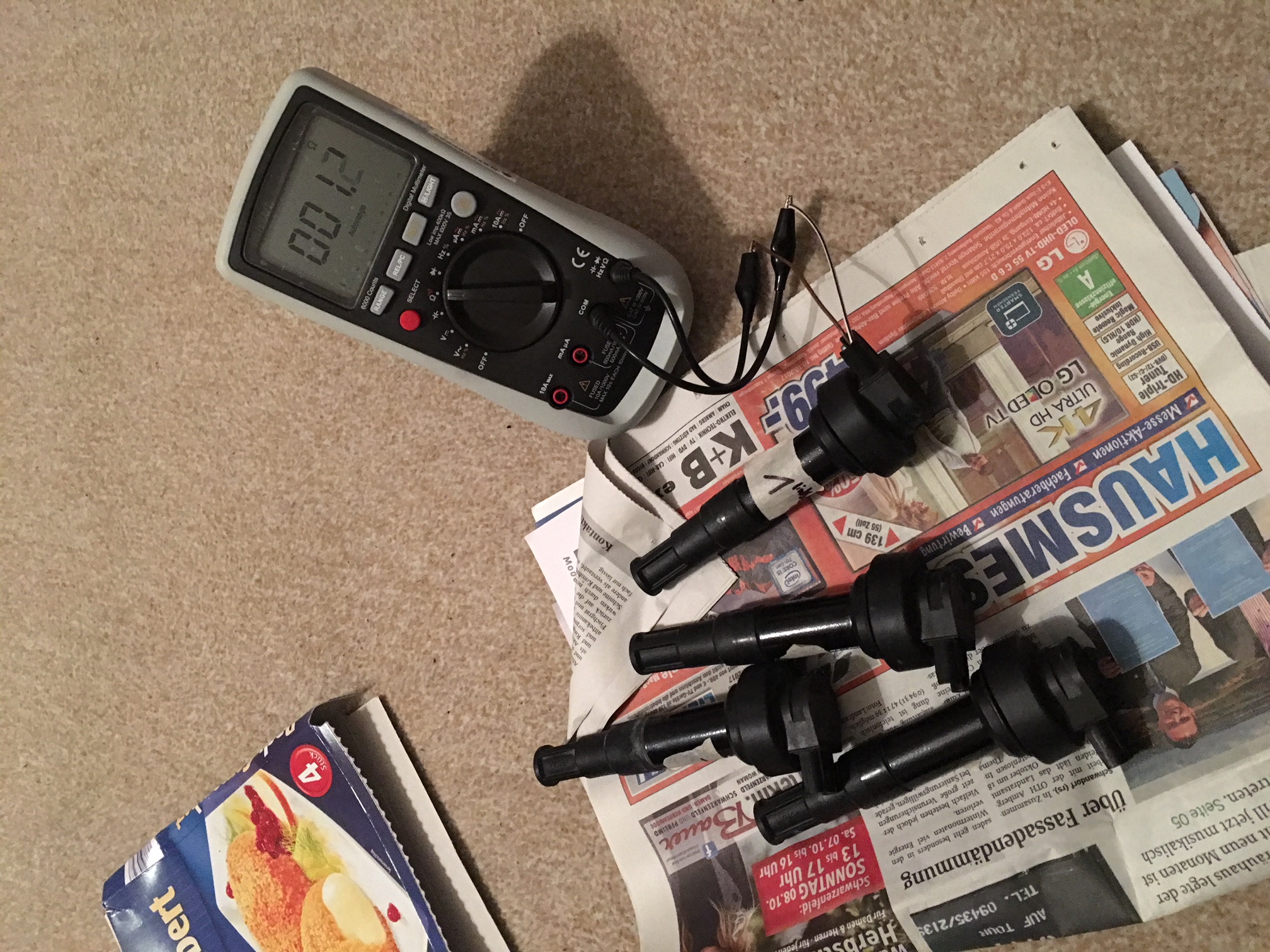 Jetzt kann ich morgen nur noch die Leitungen von Motorsteuergerät zu den Zündspulen durchmessen und anschließend auf Verdacht die neuen gebrauchten Zündspulen einbauen ... mehr fällt mir momentan nicht mehr dazu ein