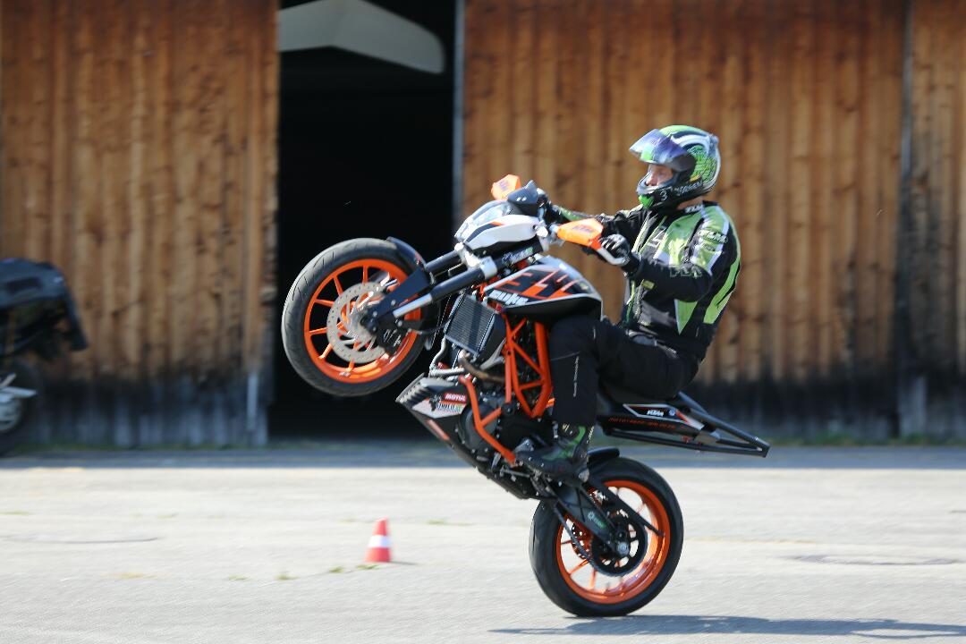 Eine Körperspannungsübung: Die linke Hand vom Lenker nehmen, nur die Rechte bleibt am Gasgriff. Das erinnert ein bisschen an Bullenreiten auf Rodeo-Veranstaltungen. In dieser Sitzhaltung wird jetzt der Gasgriff bedient. Anfangs noch vorsichtig, kann man nach wenigen Minuten schon ordentlich aufreißen. Dabei wird über Körperspannung die Balance gehalten. Das Vorderrad hebt bei dieser Übung schon mit 34 PS nur übers Gas vom Boden ab.