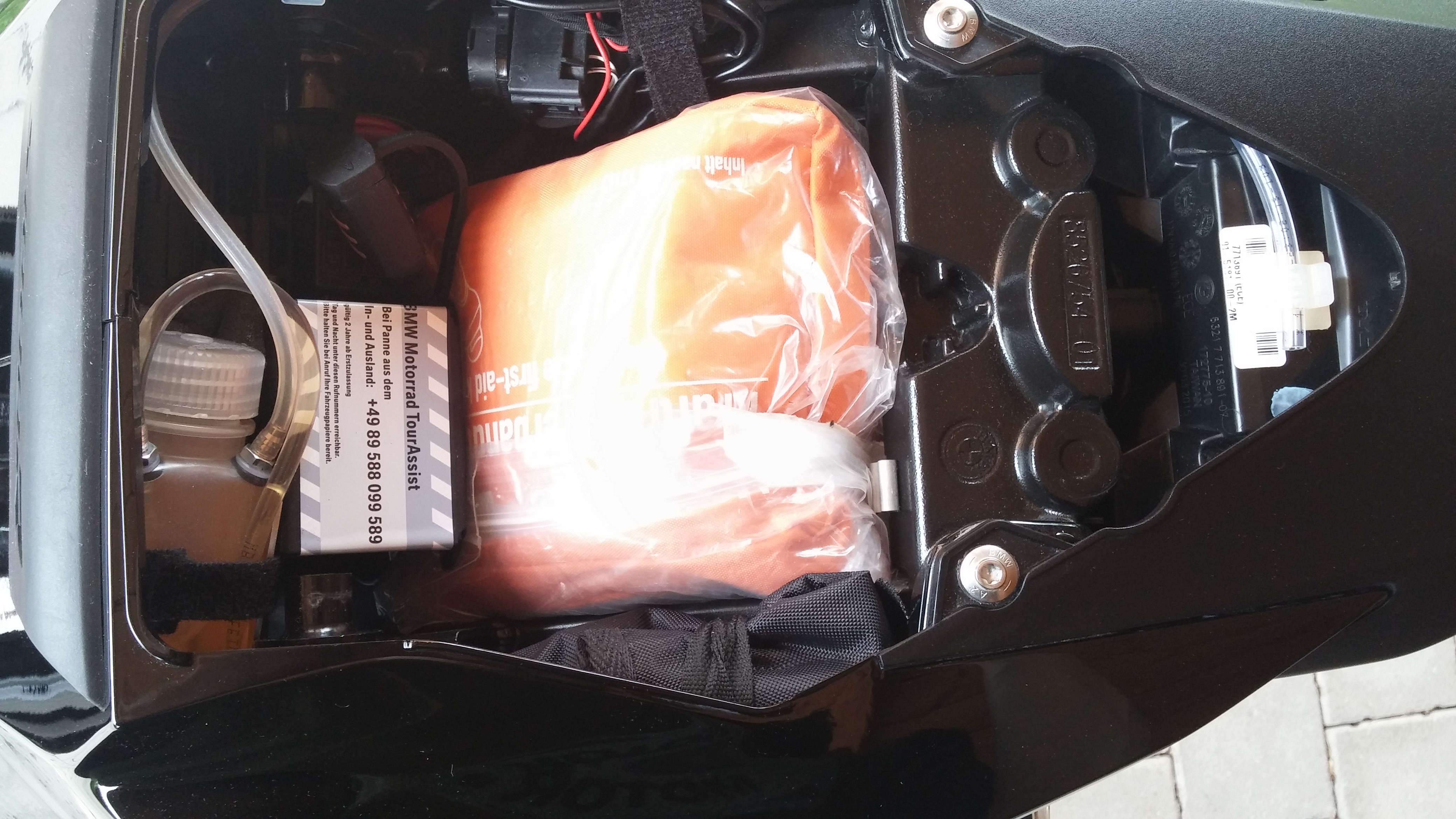 Der Tank im Heck vor dem Sicherungskasten. Für das Bordwerkzeug und Verbandszeug ist Platz frei weil alles Blinker relavante nach rechts außen verlegt wurde.