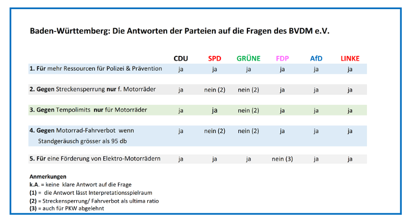 Anlässlich der Landtagswahlen (RLP + BaWü) hat der BVDM die Parteien zu Motorrad-Themen befragt. Die Antworten mit zwei interessanten Grafiken findet ihr hier: