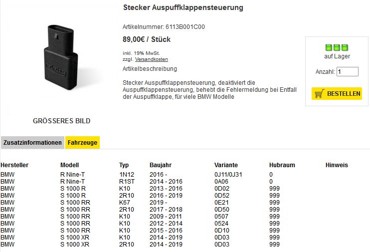 Theoretisch könnte man sowas ähnliches auch bei der BMW machen aber es darf kein dummer Stecker sein der einfach nur ein Signal vorgaukelt und die Klappe permanent offen hält. Es muss wie bei Ducati die Klappe innerhalb des Fahrgeräuschmesszyklus geschlossen halten. Weiss nicht ob es Anbieter für so eine Lösung gibt aber sollte nicht all zu schwer sein sowas zu entwickeln. Es könnte auch ein Software Flash ohne Hardware sein. Und um dann noch komplett legal unterwegs zu sein muss dann das höhere Standgeräusch eingetragen werden.