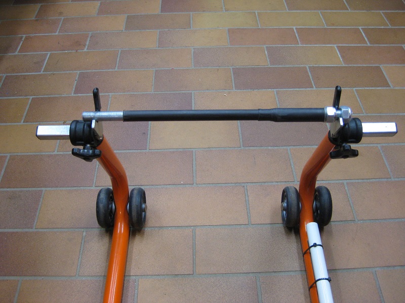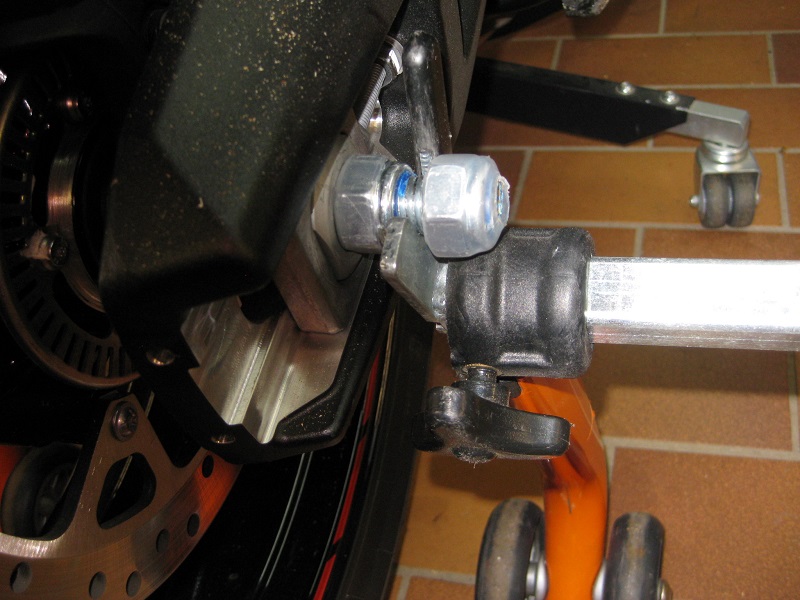 RRwolli hat geschrieben:ich habe hinten Kettenspanner mit Bobbins und nutze den Kern Stabi mit Klick Adaptern. Ist für mich das sicherste Aufbocken. Vorne gehe ich unter die Gabelbrücke mit einem etwas modifizierteren Dorn. Die Bremsleitung habe ich mit einer Blechmutter ca. 6-8 mm aus der Mitte verlegt.