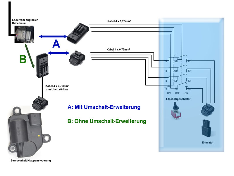 Kurzes Verbindungsstück von ca. 25 cm ( Stecker PAPA - Kabel 4x 0,75²- Stecker MAMA) vom Ende des Kabelbaums bis an den Stellmotor. Wenn dieses Verbindungsstück eingesteckt ist, ist quasi alles original, bis auf das Zwischenstück. So kanns dann auch zum Händler bei Inspektion / TÜV etc. gehen.