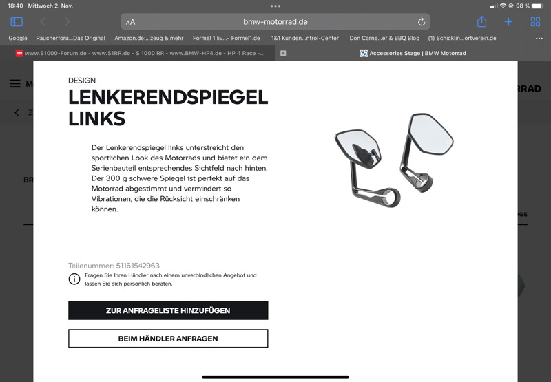 Sternweich hat geschrieben:Streety675 hat geschrieben:Wenn ihr euch z.b. Bei Liebmann die Originalen Lenkerendenspiegel (51161542963/51161542964) bestellt braucht ihr noch folgendes