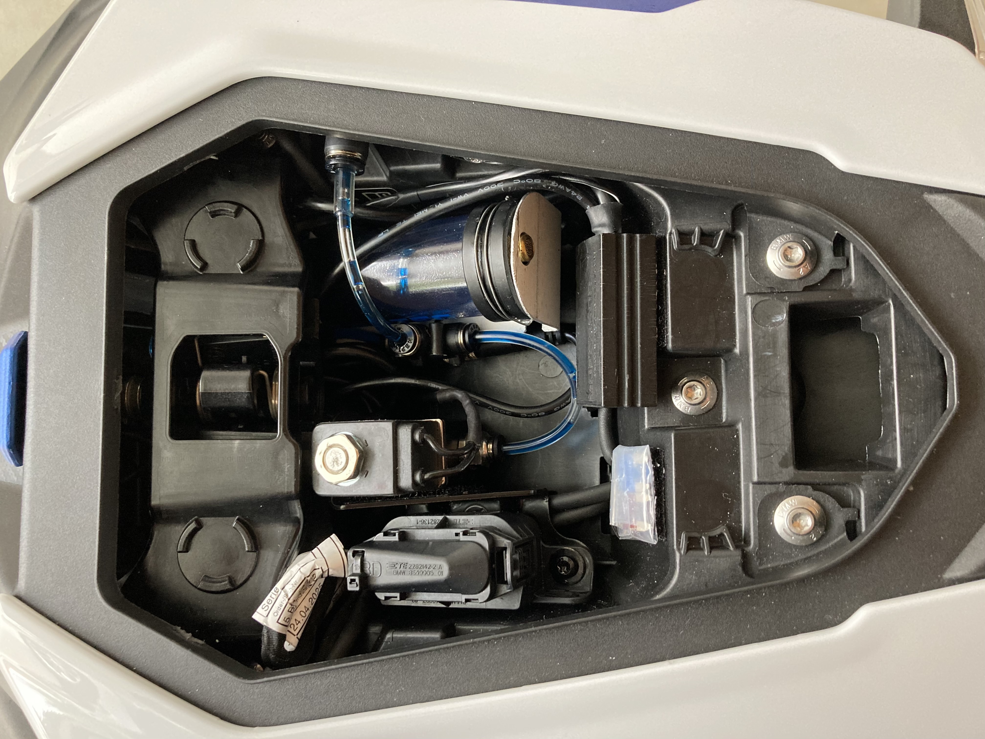 Der 60 ml Tank, das Dosierventil und die Steuereinheit haben ihren Platz unter der Heckabdeckung gefunden. Dazu habe ich mich von der (unnützen) USB Dose und dem Bordwerkzeug getrennt. Lediglich der Schraubendreher und die Ersatzsicherungen liegen nun noch in der Mulde drin.